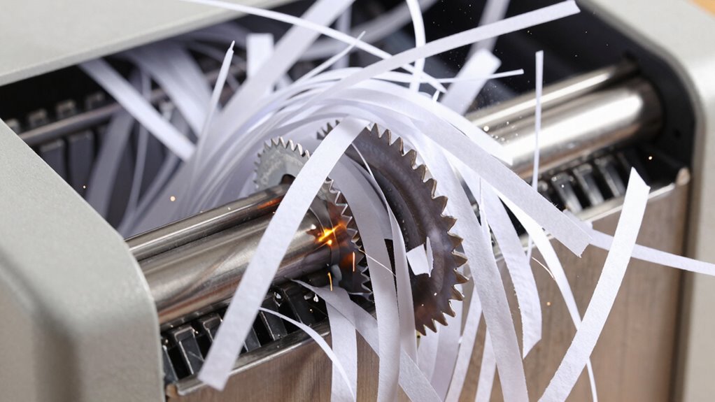 Surprisingly, your best bet to avoid jams is to use specialty paper or recycled fibers. Ironically, these eco-friendly options often cause less trouble because they’re designed to be thinner or more uniform, reducing the risk of paper jams. Regular, thick paper tends to clog up shredders faster. So, if you want smoother shredding, opt for specialty or recycled fiber paper—your shredder will thank you.