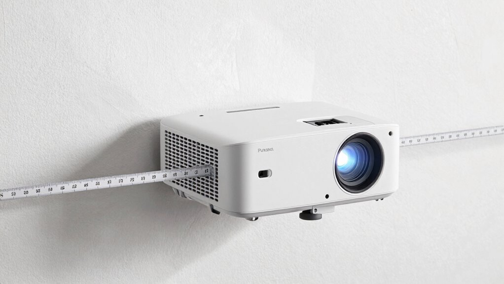 Your throw distance, the space between your projector and screen, directly affects how well your image turns out. If it’s too short for a standard projector, your picture might be small or blurry, while too long can cause distortion or shadows. Choosing the right throw distance guarantees your image is just the right size and clarity. Keep exploring to discover how to match your space with the perfect projector setup for the best viewing experience.