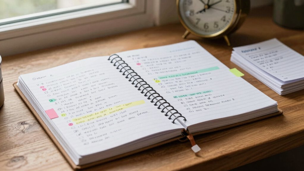 While analog methods like flashcards and handwritten notes are effective, they often come with challenges such as inconsistent review schedules and physical clutter. To overcome these, consider using mnemonic devices to make memorization easier and more engaging. Establish a regular review routine, perhaps by setting specific days or times each week. Peer collaboration can also boost motivation and accountability, as studying with others keeps you consistent. Additionally, organizing your materials into clearly labeled folders or containers minimizes clutter and keeps your study space tidy. Remember, combining techniques like mnemonic devices and peer collaboration not only addresses common obstacles but also enriches your learning process. With discipline and smart organization, you can make analog spaced repetition both manageable and effective.