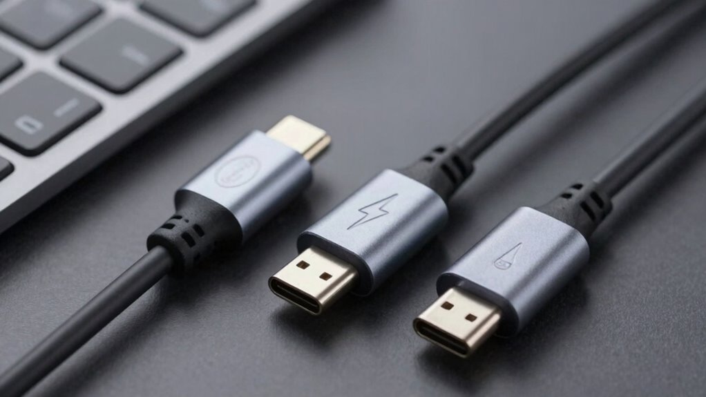 Not all USB-C ports are compatible with Thunderbolt or DisplayLink functions. Compatibility myths often lead people to believe every port offers the same versatility, but that’s not true. Some USB-C ports support only basic data transfer and charging, while others are equipped for Thunderbolt or DisplayLink features. Check your device specifications to confirm port capabilities, ensuring you get the port versatility you need for high-speed data, video, or external displays.