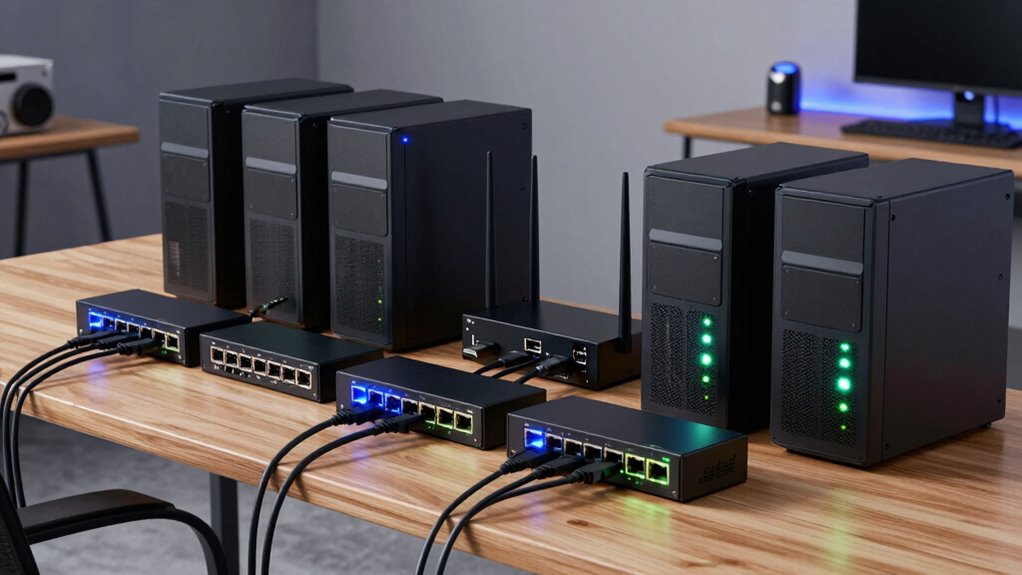 When setting up my home lab, ensuring the switch works seamlessly with my existing devices is a top priority. I check that it supports key Ethernet standards like IEEE 802.3ab, 802.3bz, and 802.3ae to ensure compatibility. I verify that the switch has the right ports, such as RJ-45 for copper cables or SFP/SFP+ for fiber connections, matching my cabling. Auto-negotiation features are essential so the switch can connect smoothly at different speeds like 1G, 2.5G, or 10G. I also confirm it supports backward compatibility with older devices, ensuring they work without issues. Finally, I make sure the firmware and management software align with my device management protocols for a reliable, integrated network.