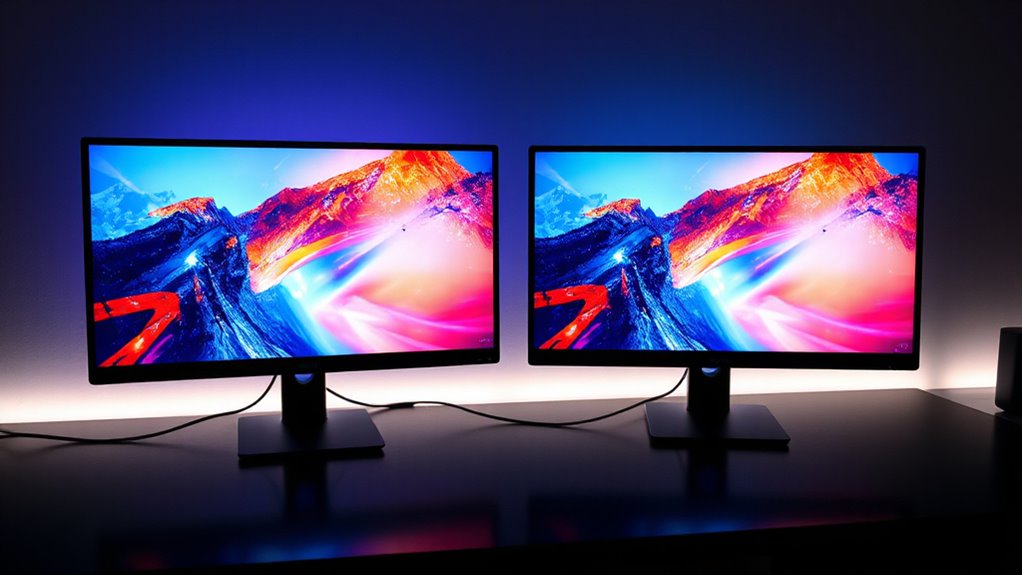 Color accuracy and gamut are key considerations after ensuring your monitor delivers sharp resolution and clarity. A top-tier 27-inch 5K monitor should cover at least 99% of DCI-P3 and 100% of sRGB, guaranteeing vibrant, true-to-life colors. Accurate color reproduction is often measured by Delta E values below 2, which is vital for professional tasks like photo editing and design. Wide color gamuts like DCI-P3 and sRGB allow the monitor to display a broad spectrum of colors, enhancing creative work. Additionally, calibrated or factory-precalibrated screens help maintain consistent color accuracy right out of the box, reducing the need for manual adjustments. Features such as ambient light sensors and backlight adjustments further optimize color performance in various lighting conditions.