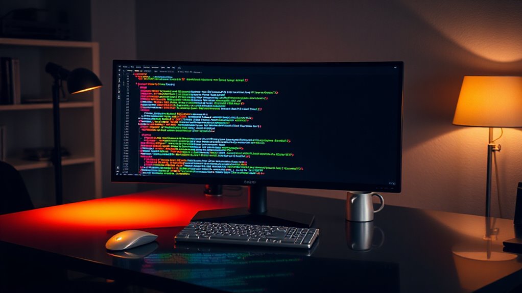 Since I spend hours coding and designing, I prioritize monitors with high color accuracy and wide gamuts to guarantee my work looks consistent and vibrant. A high color gamut, like 99% sRGB or higher, ensures colors are accurate and vivid, which is essential for clear interfaces and visual consistency. Wide coverage like DCI-P3 or Adobe RGB allows for precise color representation, especially important when working on color-sensitive projects. Monitors with factory calibration or hardware calibration support help maintain this accuracy over time, minimizing drift. HDR support, such as HDR10 or DisplayHDR 400, enhances contrast and color depth, making visuals sharper and more detailed. Additionally, consistent color accuracy across wide viewing angles reduces color shifts, which is critical during collaborative sessions or long hours of work.