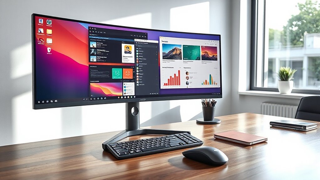 Imagine spreading out your work like a vast canvas—34-inch ultrawide monitors do just that, boosting my multitasking efficiency. With a wide, seamless display, I can have multiple windows open side-by-side without toggling back and forth. It’s like having extra desks in my workspace, making it easier to organize and switch between tasks swiftly. These monitors truly turn multitasking from chaos into a smooth, productive flow.