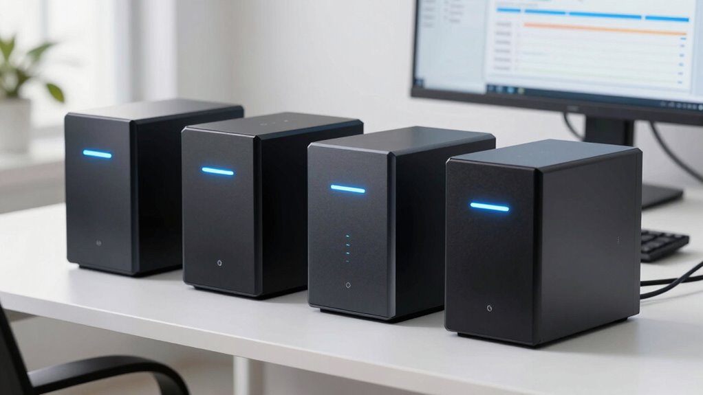Choosing a 4-bay NAS that meets your small business’s storage capacity needs involves more than just size; performance plays a key role in guaranteeing smooth operations. You want high sequential read/write speeds—over 500 MB/s—to handle large data transfers efficiently. A powerful multi-core processor, like an Intel Celeron or ARM Cortex-A55, is essential for smooth multitasking and quick data processing. Sufficient RAM, typically 8GB or more, helps with caching and running multiple applications without lag. Dual 2.5GbE or higher network ports are recommended for fast, reliable data transfer and redundancy. Additionally, support for SSD caching via M.2 NVMe slots can considerably boost performance for frequently accessed data. Prioritizing these factors ensures your NAS operates smoothly and meets your business demands.
