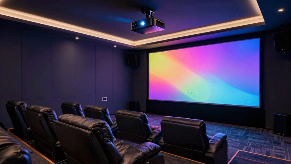 Like a lighthouse guiding ships, a dark room helps 4K projectors shine at their best. Not all require total darkness, but the brighter the environment, the more you’ll notice washed-out colors and less detail. I recommend a dim or controlled lighting setup for ideal viewing, especially with high-end projectors. This way, you get vibrant images that truly pop, making your home theater experience feel immersive and cinematic.