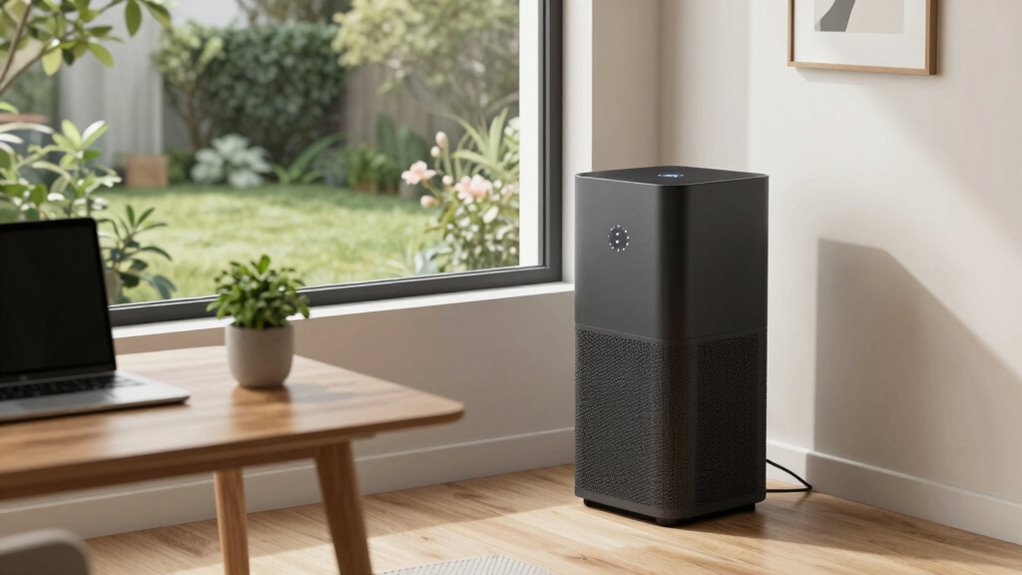 Maintaining ideal air purification requires paying close attention to filter life and maintenance, as these directly impact performance. Most air purifiers last between 3 to 6 months before filters need replacement, depending on usage and air quality. Regularly cleaning or replacing filters guarantees maximum filtration and indoor air quality. Washable pre-filters can extend overall filter life and cut costs when cleaned frequently. Many models feature filter reminder indicators or timers, helping me stay on top of maintenance schedules. It’s also essential to use genuine manufacturer filters, as they guarantee the purifier performs as intended and prevent potential damage or reduced effectiveness. Staying proactive with filter care ensures my home office remains a healthy, clean environment without sacrificing efficiency.