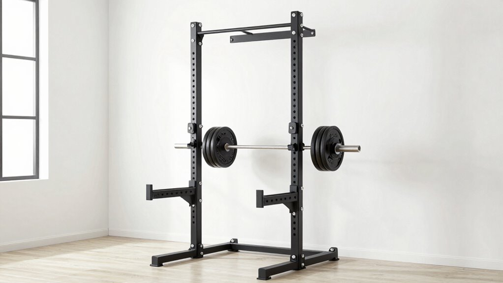 Yes, space-saving power racks often include safety features like adjustable safety bars, which catch the barbell if you fail a lift, and safety pins for extra security. Some models also have padded j-cups to protect your equipment and safety straps for added stability. I recommend checking these features before purchasing, as they’re vital for safe, effective workouts, especially in smaller spaces where room for error is limited.