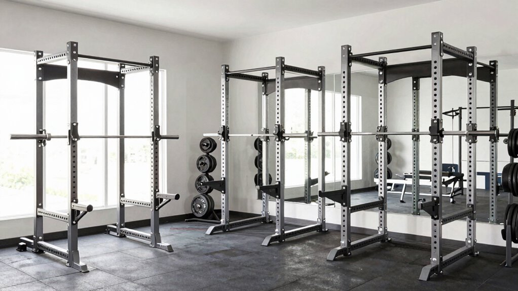 Ever wondered how tall users can maximize comfort and safety during workouts? The key is choosing a power rack with adjustable height features that fit your longer limbs. A higher maximum height allows for unrestricted pull-ups and overhead presses, preventing awkward positioning. Extra-tall or custom-height racks eliminate the need for unsafe stretching or compromised form. Ergonomic designs, like extended pull-up bars and taller safety spotter arms, also boost comfort by accommodating your height naturally. Additionally, sufficient vertical clearance is crucial to avoid hitting the ceiling or overhead obstacles, especially during explosive lifts. Prioritizing these features ensures your workouts are both safe and comfortable, letting you focus on strength gains without worrying about space or equipment limitations.