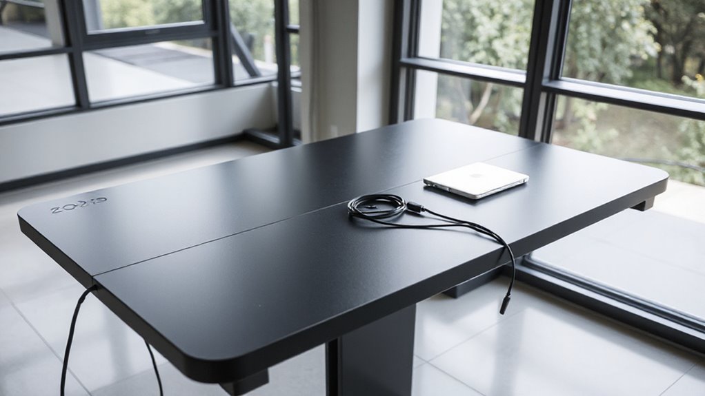 Cable management features make desk height adjustments smoother and safer. I’ve noticed that well-designed channels and clips keep cords organized, preventing tangling when I raise or lower my desk. Without good cable management, cords can snag or pull, making adjustments cumbersome. These features guarantee my cables stay neat and secure, so I can change my workspace height effortlessly without worrying about disrupting connections or damaging cords.