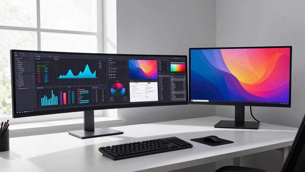 Choosing between ultrawide, 4K, or dual screens considerably boosts your multitasking efficiency by offering better ergonomic benefits and visual clarity. Ultrawide screens provide seamless workspace for multiple apps, reducing window switching. 4K displays enhance detail, making multitasking easier on your eyes. Dual screens give you dedicated space for different tasks, improving workflow. You’ll notice less strain and more productivity as each setup supports your multitasking needs effectively.